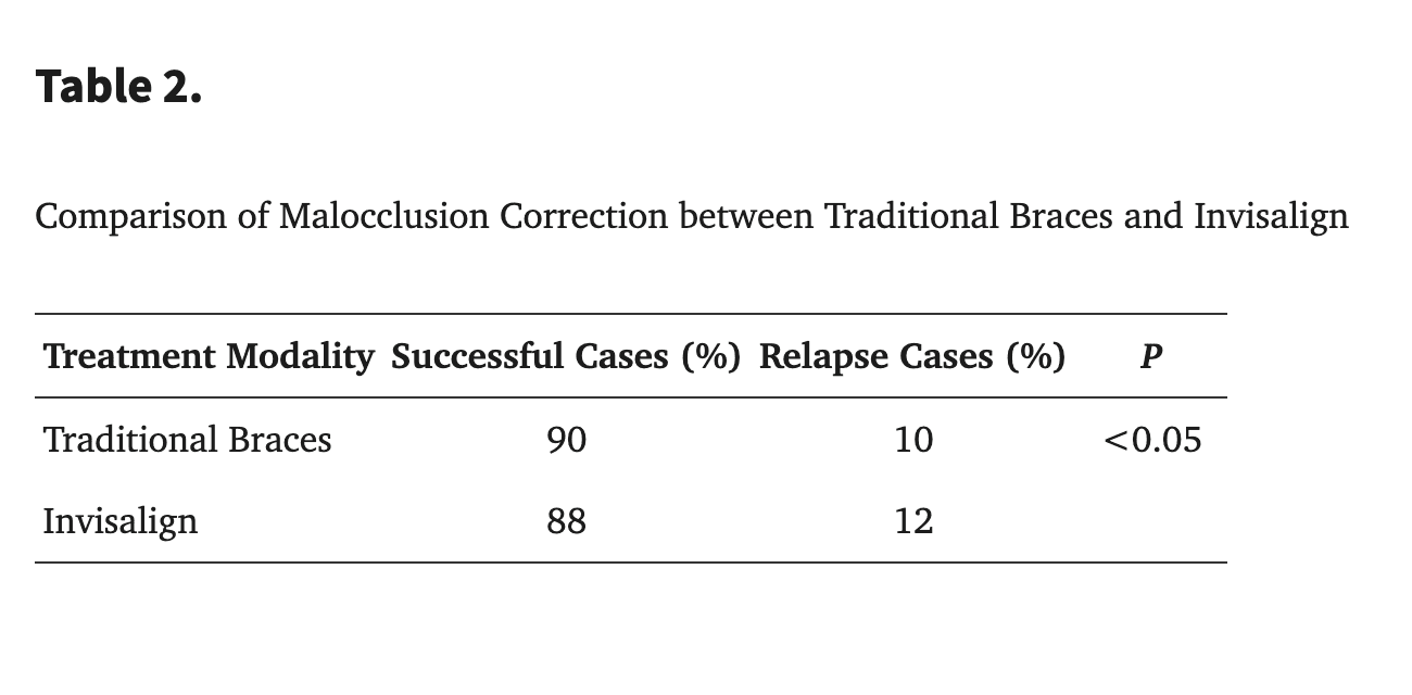 Researchers conducted a retrospective analysis of patients treated at a tertiary care center between 2020 and 2022. The study included patients aged 12 to 18 with mild to severe malocclusions treated with either conventional braces or Invisalign. Outcome measures included treatment duration, degree of malocclusion correction, and long-term stability, with statistical significance set at P less than 0.05.