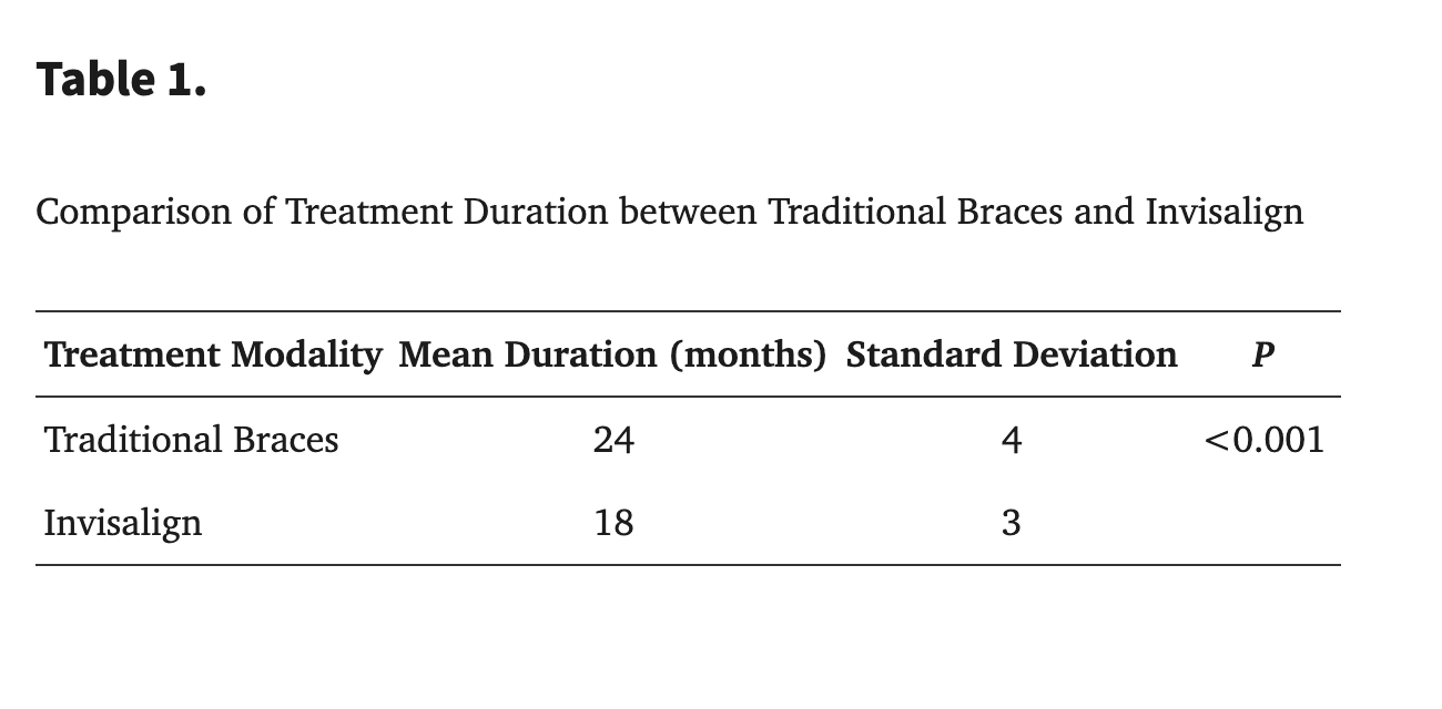 One of the cleaner findings in this study is the difference in treatment time. Invisalign patients completed treatment in a mean of 18 months compared to 24 months for conventional braces, a statistically significant difference at P less than 0.001. A six-month reduction in active treatment time is not trivial, particularly for adolescent patients balancing school, sports, and social life.